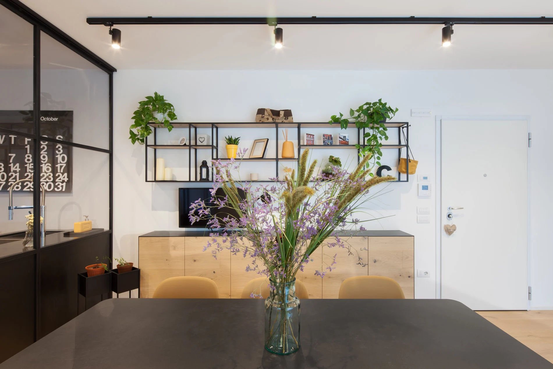 L’ingresso è posto sul lato lungo del living, che è stato idealmente diviso in tre zone: area relax con ampio divano, zona pranzo con grande tavolo, cucina separata da una vetrata industriale ma in continuità visisa con il resto del locale.